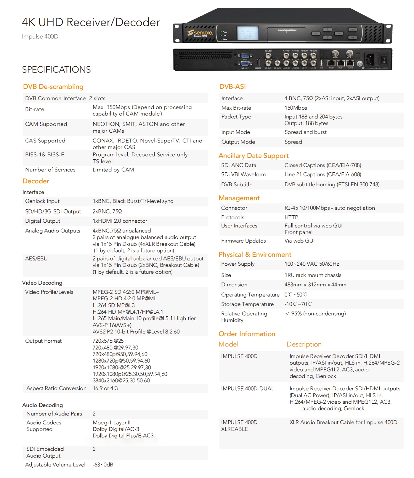 Impulse 400D is a powerful and cost-effective 4K UHD receiver decoder/gateway that supports MPEG-2/H.264/H.265/AVS+/AVS2 UHD/HD/SD video decoding and major audio decoding.